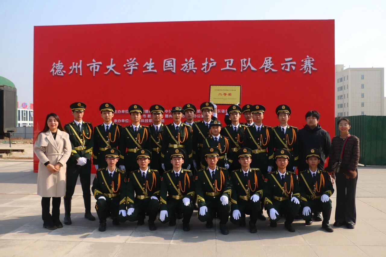 开幕式后,德州市大学生国旗护卫队展示赛拉开帷幕。各高校国旗护卫队依次登场,队员们以挺拔昂扬的身姿、铿锵有力的步伐全方位展现日常训练的扎实成果。我校国旗护卫队队员正步铿锵、动作精准,从旗手擎旗的稳定姿态,到护旗方阵的协同变换,每一处细节皆彰显日常训练的扎实成果,将“护我国旗,扬我国威”的理念具象为庄重肃穆的现场呈现,其严谨作风与专业素养赢得评委与观赛师生的高度赞誉。经过专业裁判评审打分,我校国旗护卫队荣获团体二等奖,同时,我校张煜坤同学被评选为队列标兵,邵嘉胜同学被评选为标兵升旗手,魏子达老师、马纯子老师被评为优秀指导教师。