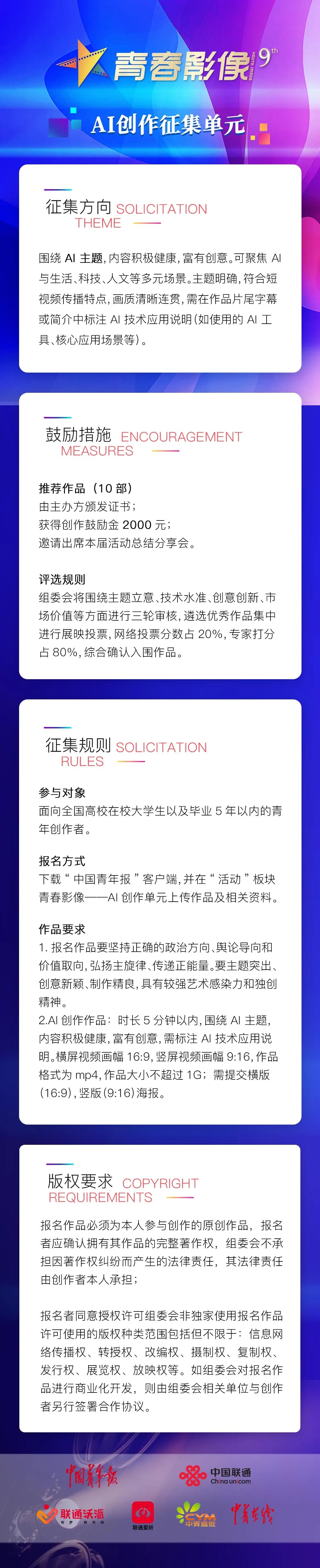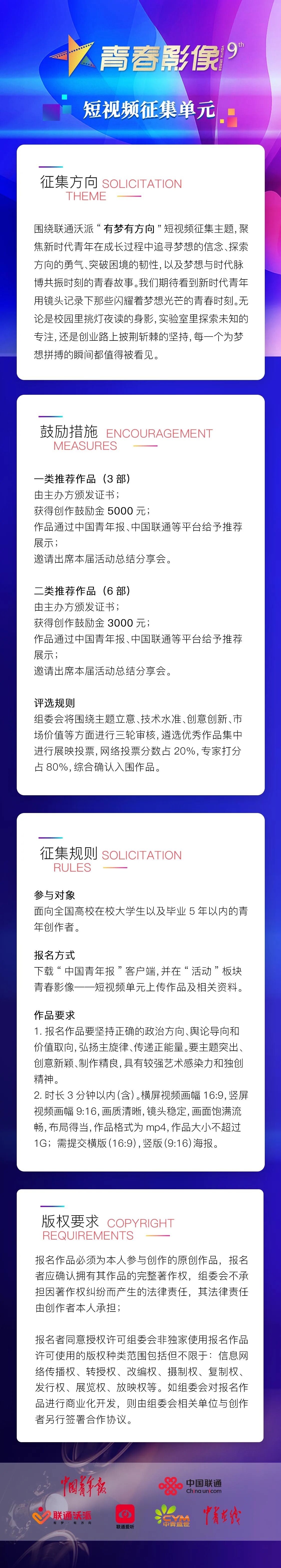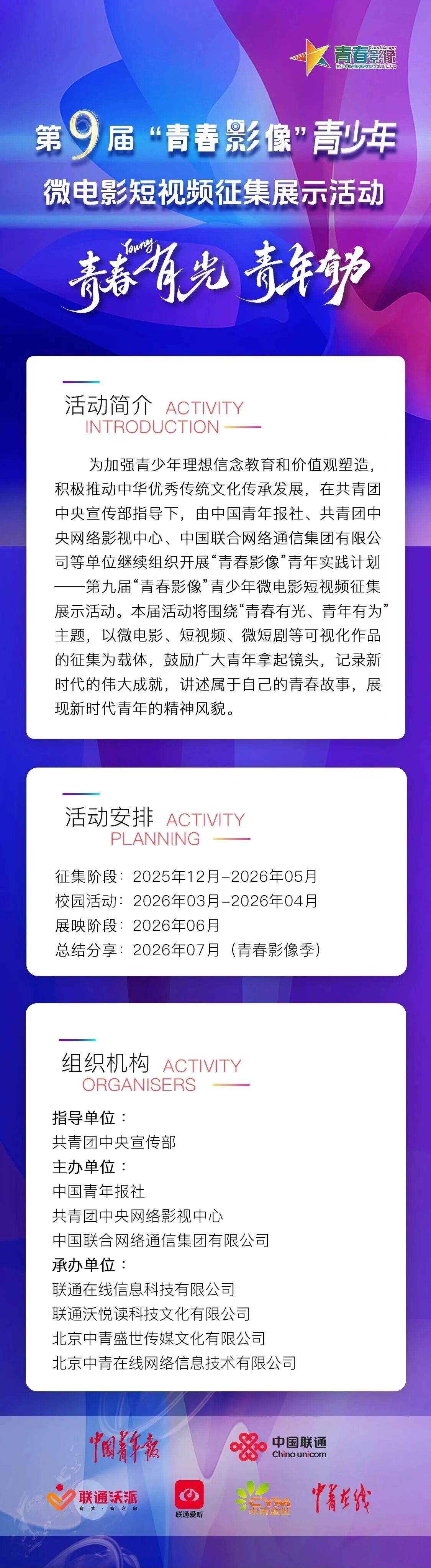 在共青团中央宣传部的指导下,由中国青年报社、共青团中央网络影视中心、中国联合网络通信集团有限公司主办,联通在线信息科技有限公司、联通沃悦读科技文化有限公司、北京中青盛世传媒文化有限公司、北京中青在线网络信息技术有限公司等单位共同承办的第九届“青春影像”青少年微电影短视频征集展示活动正式启动征集!
