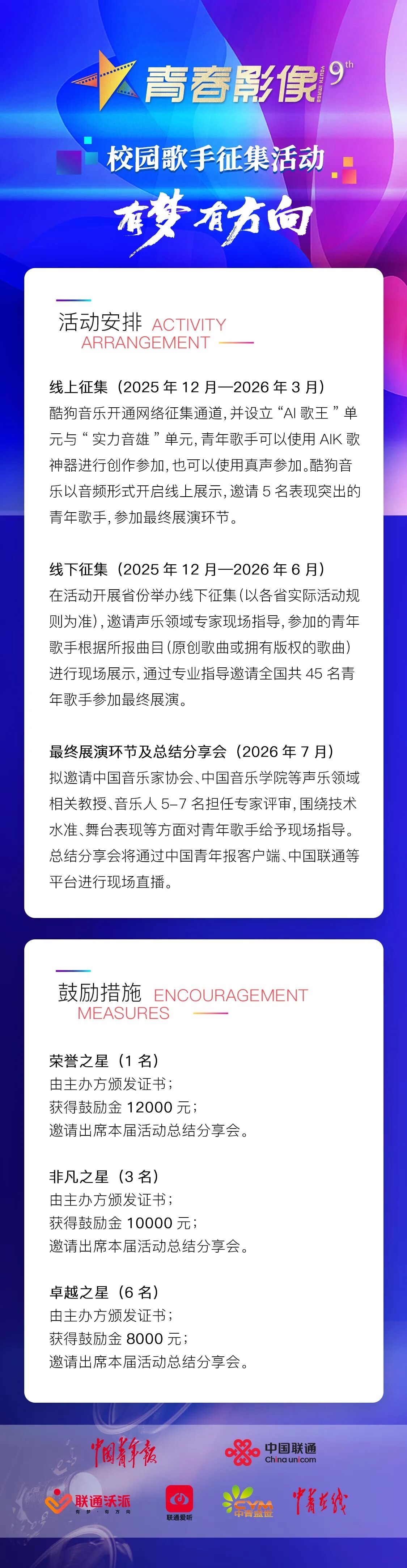 诚邀广大青年以青春为笔、以创意为墨,用影像定格热血瞬间,用歌声传递追梦力量,讲述青春故事,解锁高光时刻!
