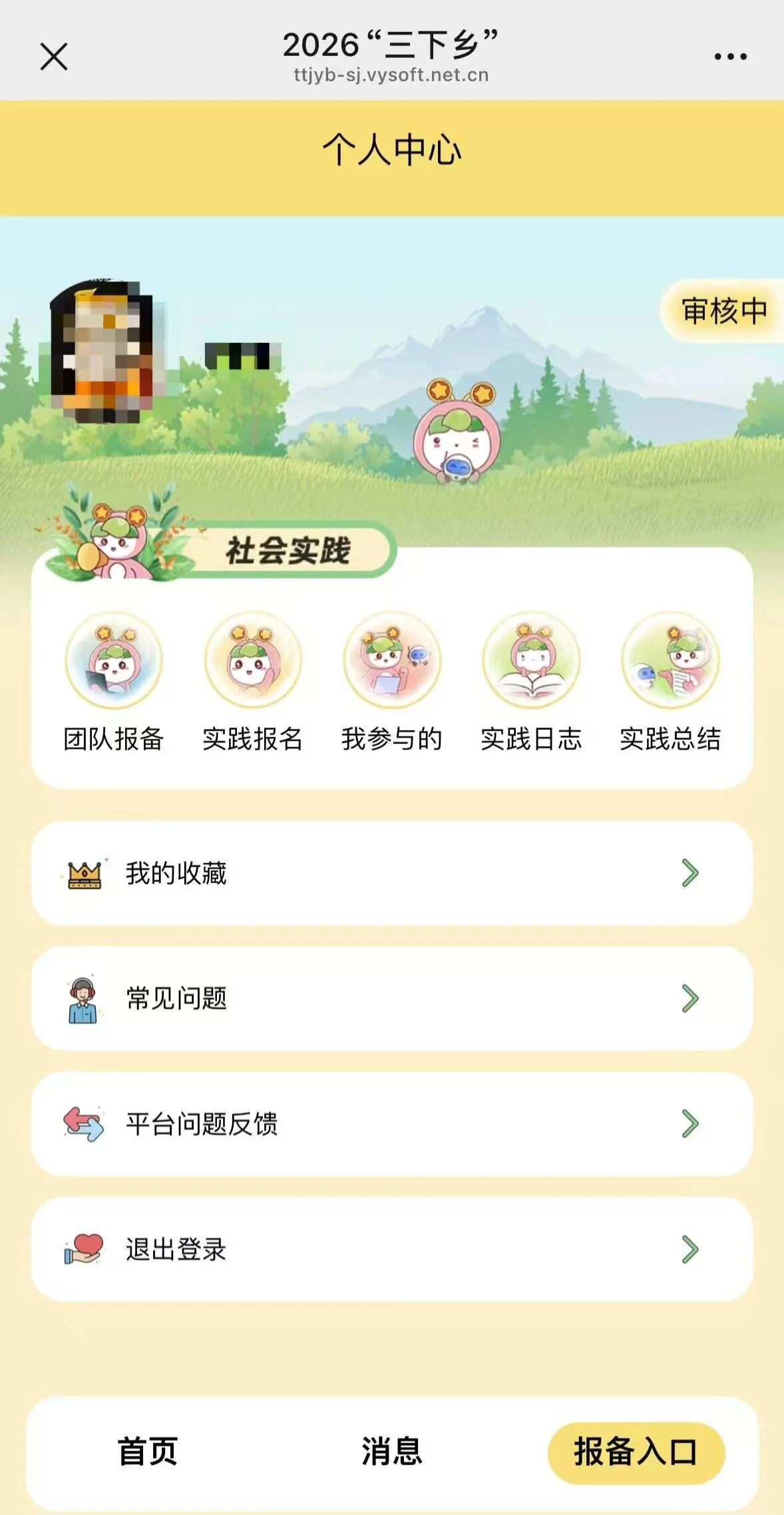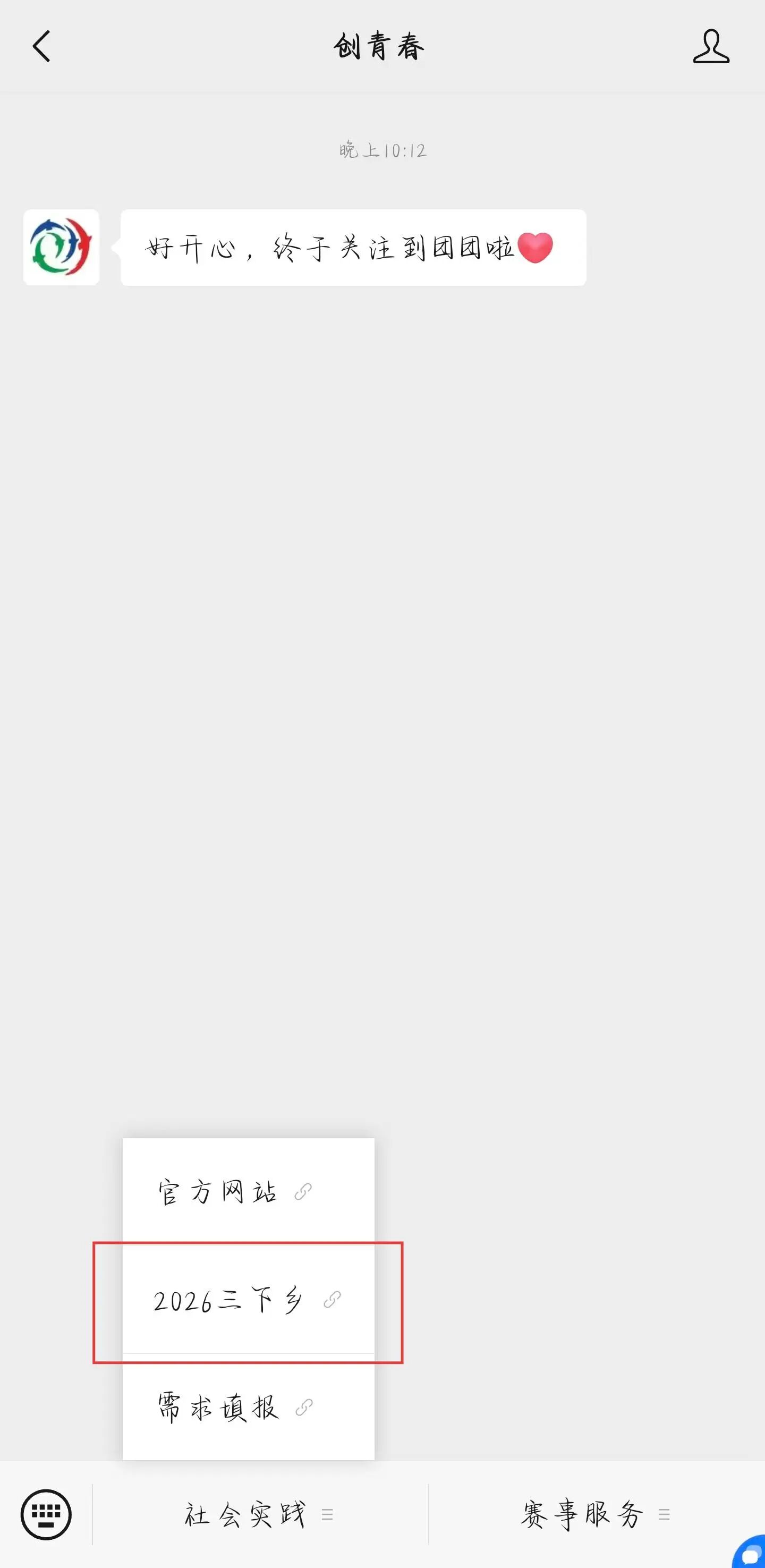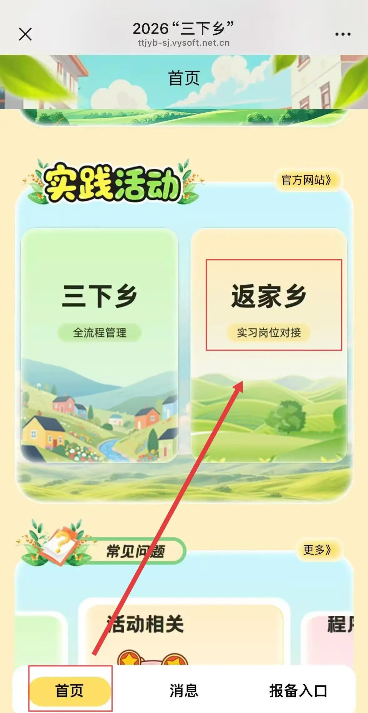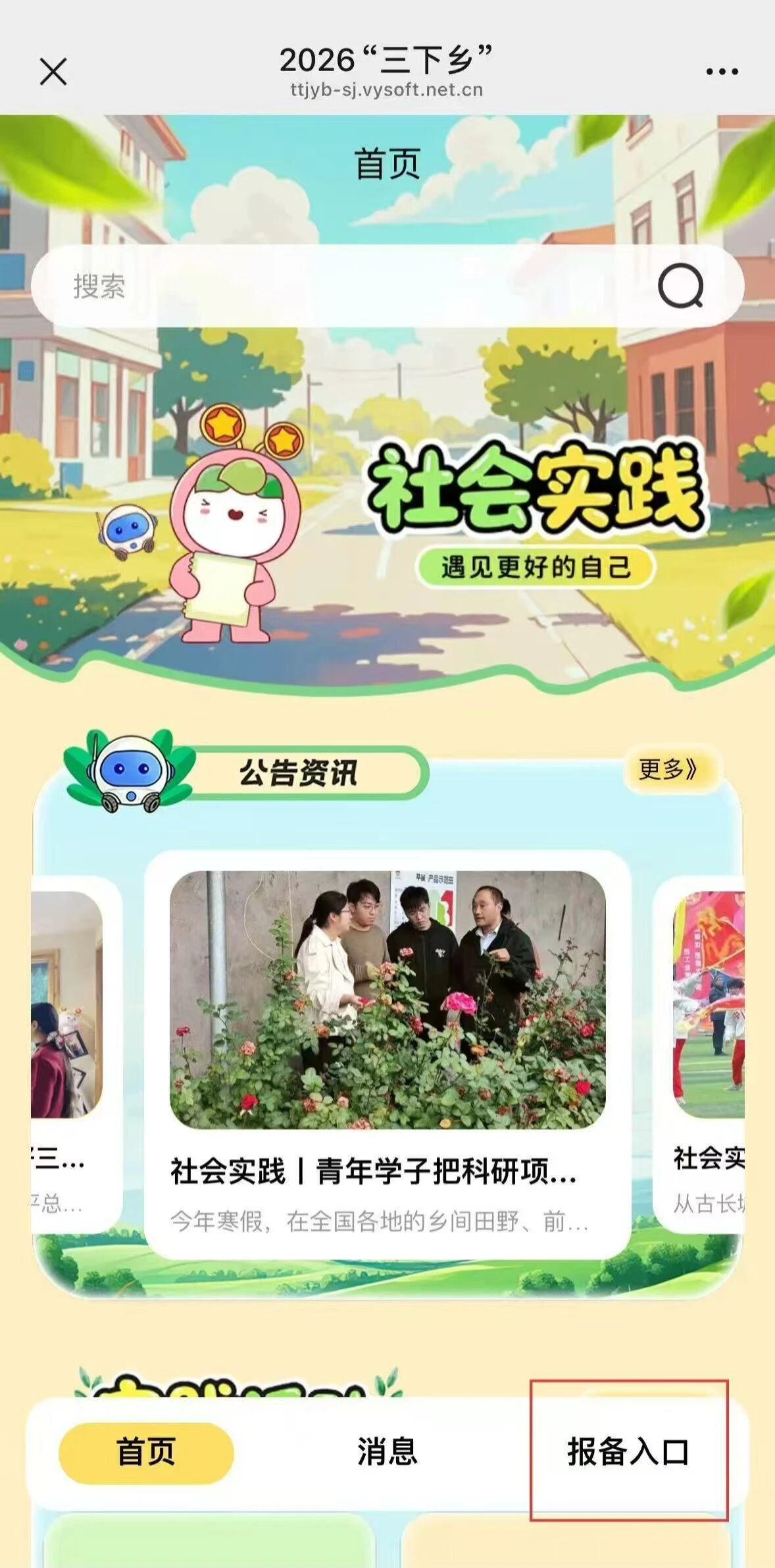 ①微信关注【创青春】公众号,选择【社会实践】中的【2026三下乡】选项,随后点击右下方【报备入口】选项。
