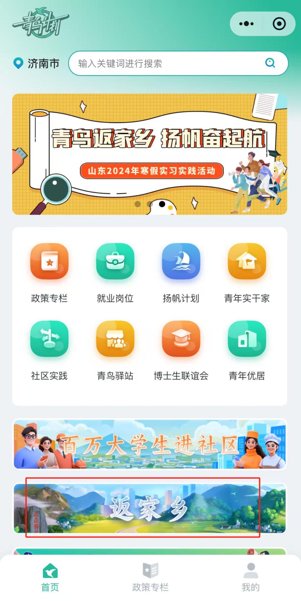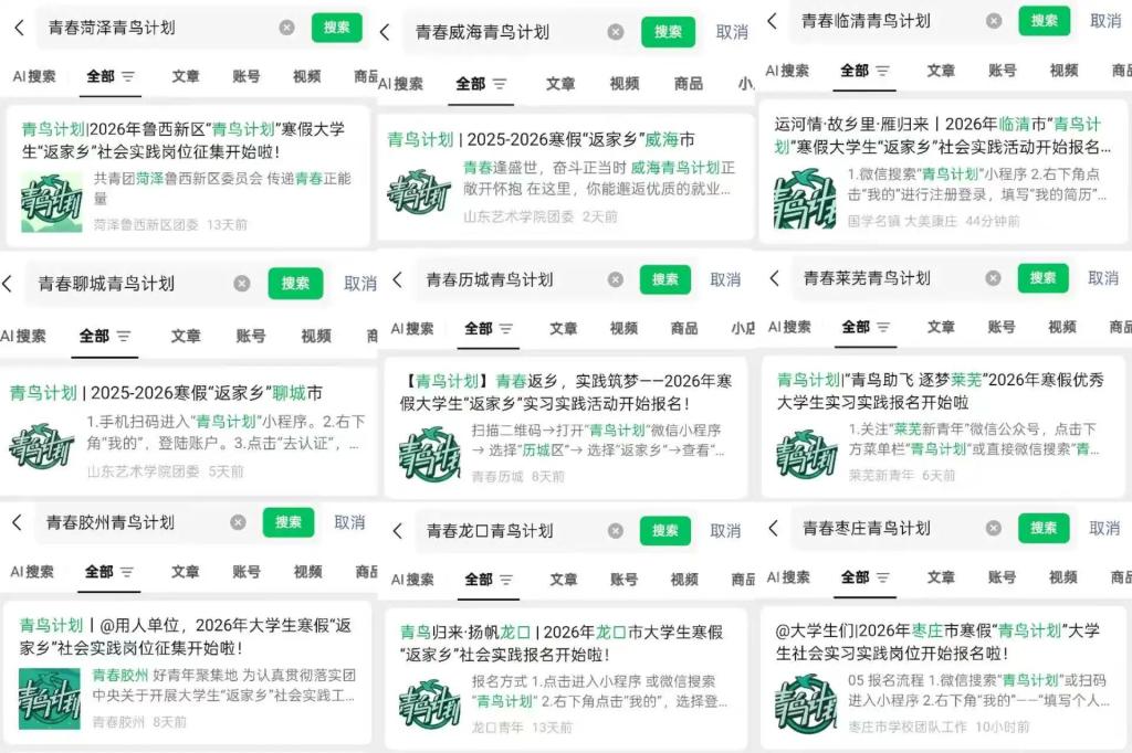 部分地区会通过团委公众号发布“返家乡”“三下乡”“青鸟计划”系列推文,介绍活动内容及要求,公布实习实践岗位。可以通过关注地方团委公众号,在规定时间报名参与寒假青鸟计划实习实践活动。
