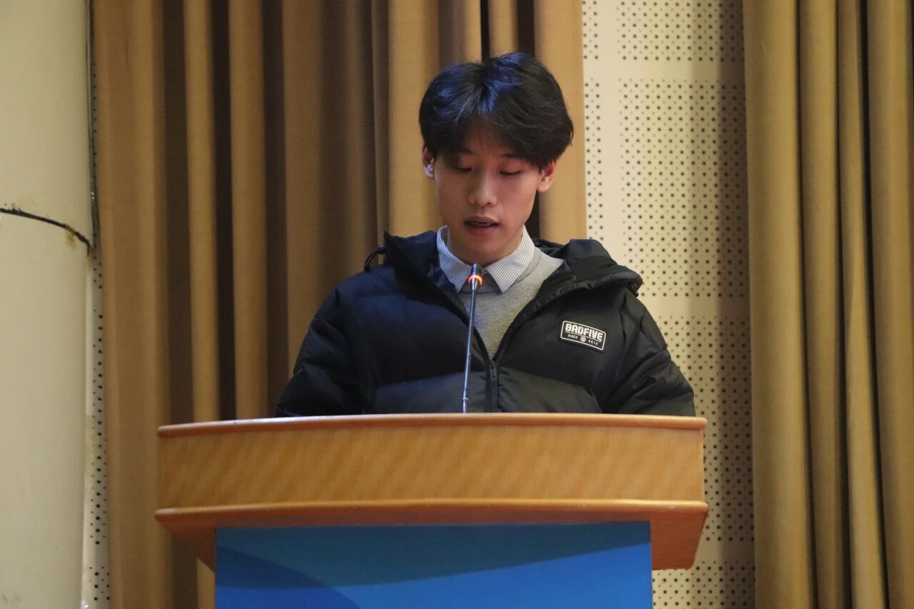 随后,社联学生代表王绍宇登台演讲。他回顾了过去一年社团开展的各类特色活动、学术交流与实践项目,细数了成员们并肩协作、攻克难题的难忘瞬间,生动展现了社团的凝聚力与青春活力。他号召大家在未来工作中继续秉持初心、勇毅前行,共同为社团发展添砖加瓦。