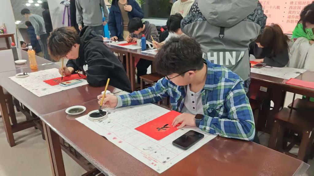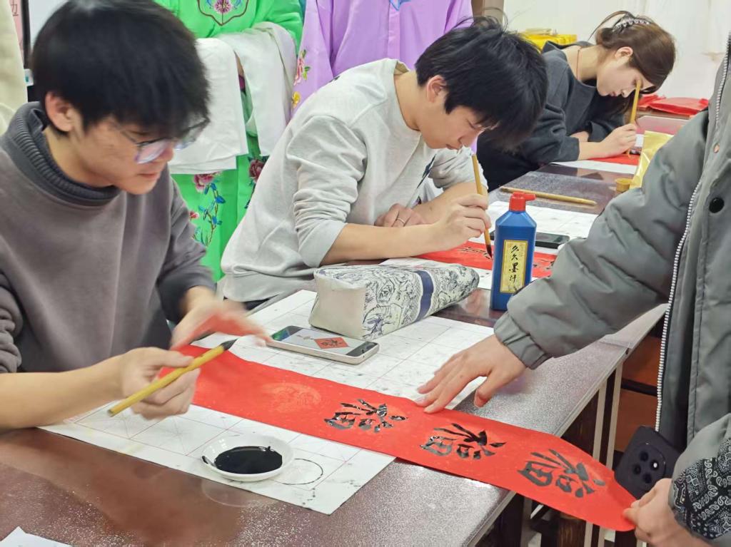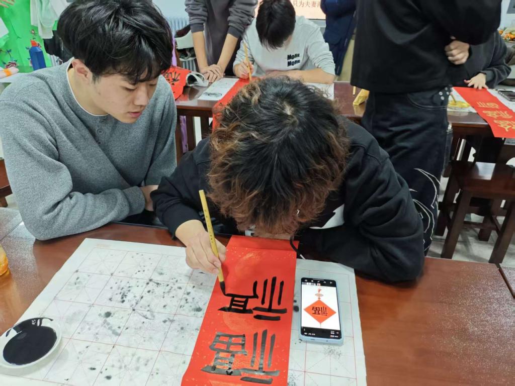 活动现场,书法社成员凝神运笔,楷、隶、行、篆各体兼备。一张张“福”字在笔下呈现,墨香淡淡散开,与实训室内木制道具的气味交融,营造出独特的艺术氛围。