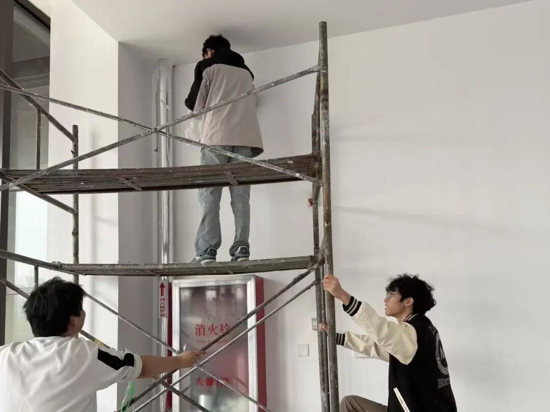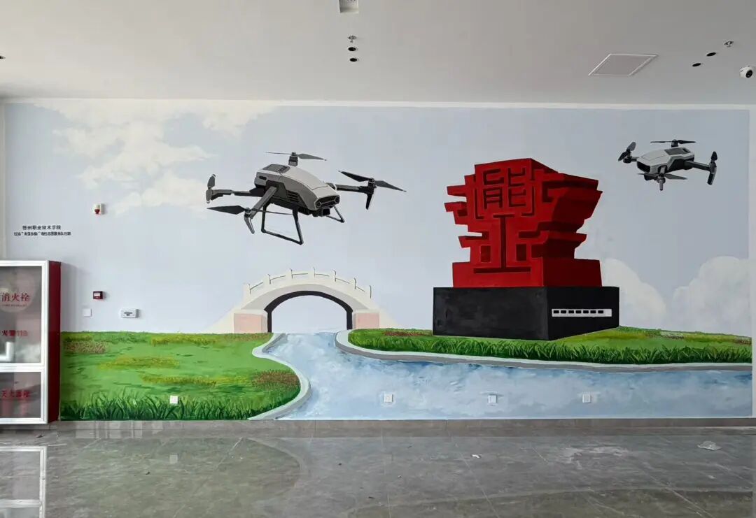 活动现场,志愿者们分工协作、默契配合,一笔一画都倾注着对学校的热爱。墙绘以我校标志性景观“德能鼎”为核心,鼎身庄重沉稳,象征“崇德尚能”的校训精神;数架无人机环绕翱翔,寓意学校紧跟时代步伐,在无人机应用等前沿领域锐意进取、智驭未来的雄心。传统与现代在此交织,生动展现了我系高质量发展的蓬勃气象。