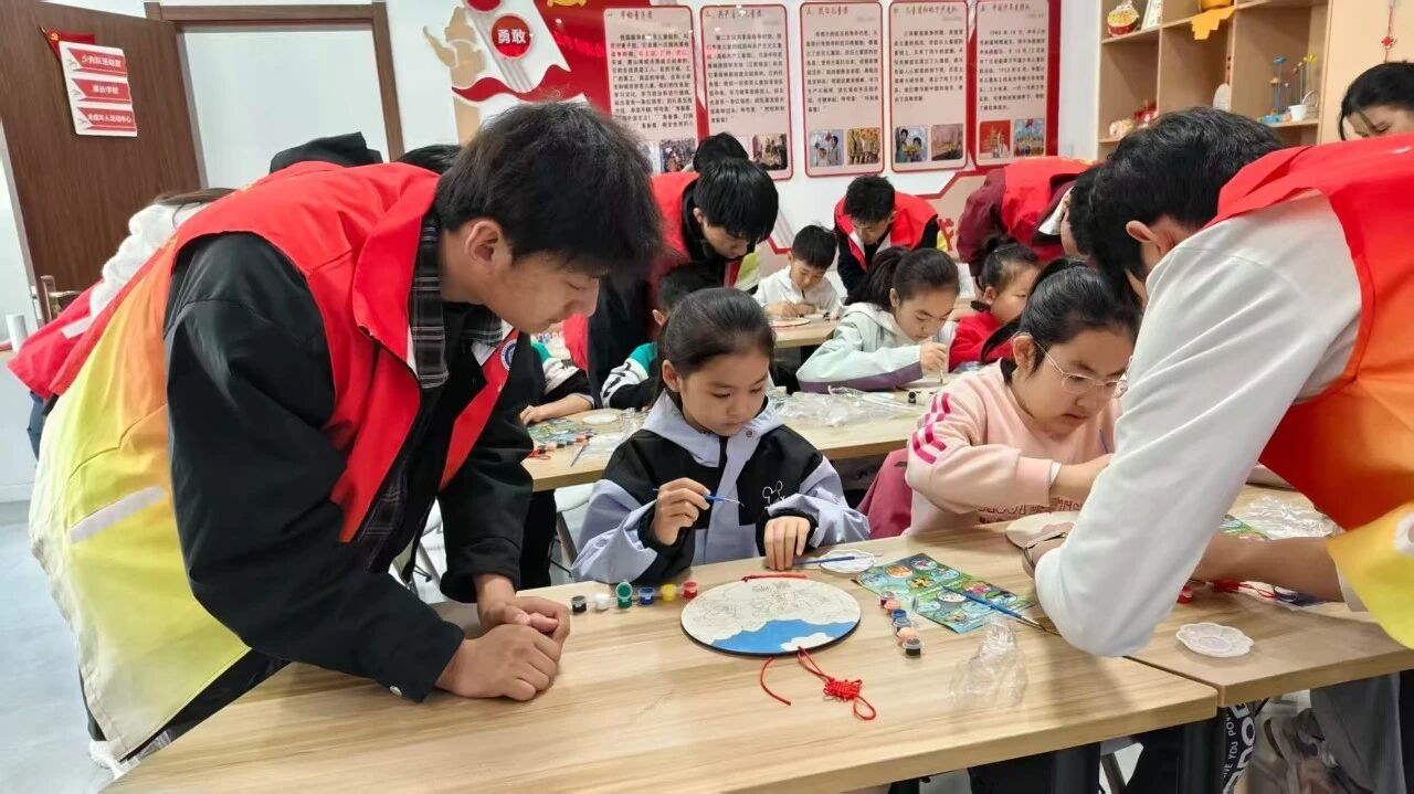 在手工互动区,志愿者们准备了空白挂件和彩绘工具,带领孩子们动手绘制属于自己的创意作品。小朋友们拿起画笔,在挂件上勾勒花朵、小动物、航天器等图案,志愿者耐心指导配色与构图,现场欢声笑语不断。一件件色彩鲜艳、充满童趣的挂件在孩子们手中诞生,大家高高举起作品合影留念,脸上洋溢着自豪的笑容。